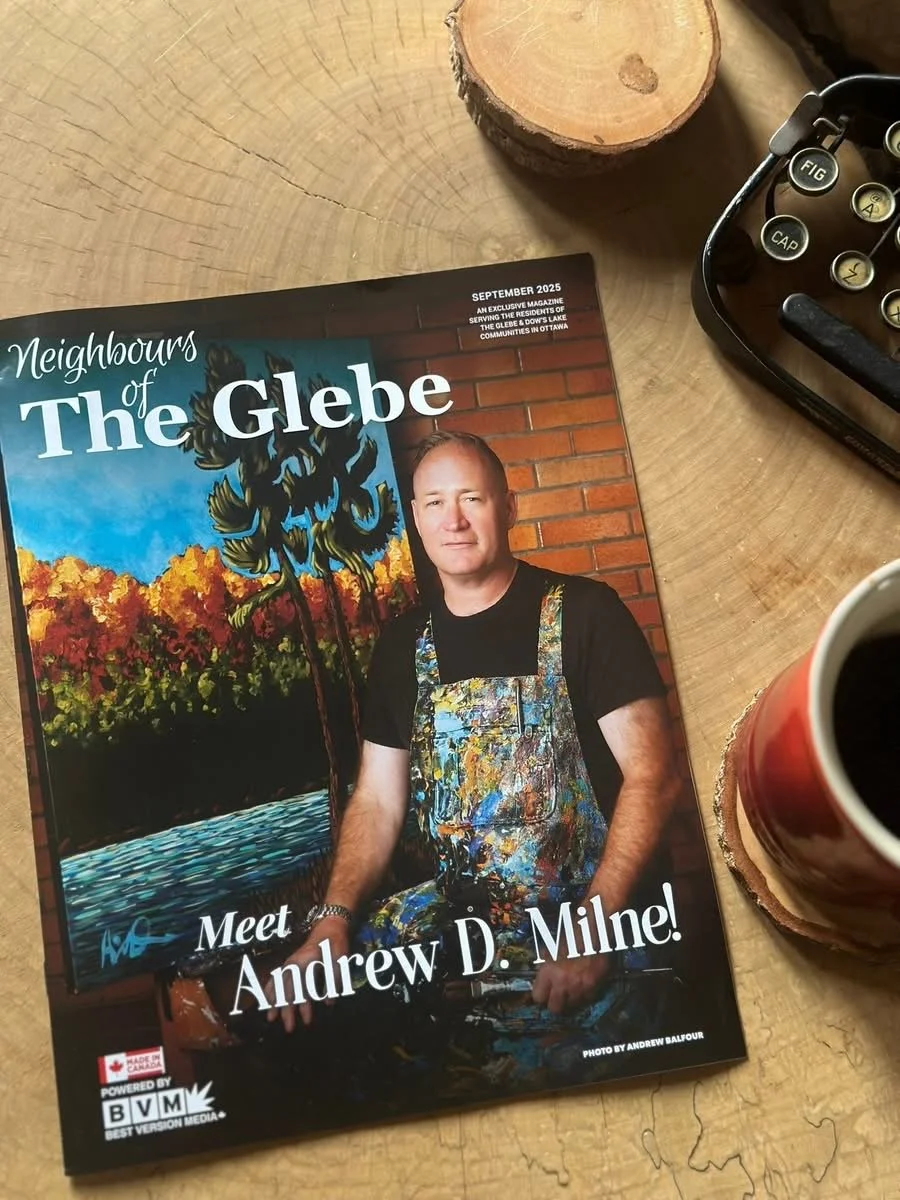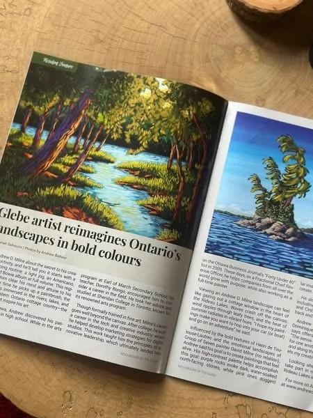 Ask Andrew D. Milne about the secret to his creative productivity, and he’ll tell you it starts with a solid morning routine: a light jog, an Americano, and a David Bowie album at full volume. This gentle warm-up helps him clear his mind and attune to his work. By the time he picks up a paintbrush, the Glebe artist is immersed in the rivers, lakes, and forests of Eastern Ontario cottage country—the landscapes that inspire his art.