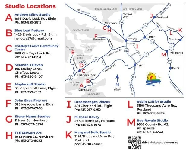 Start Your Tour at Studio A - We’re located on Davis Lock Road in Elgin, Ontario—just 10 minutes from Chaffey’s Lock, 45 minutes from Kingston, and 1.5 hours from Ottawa. View on Google Maps – Davis Lock